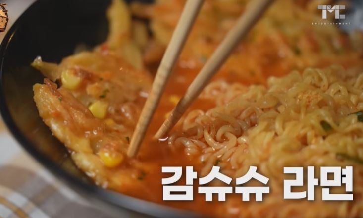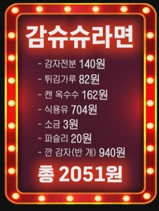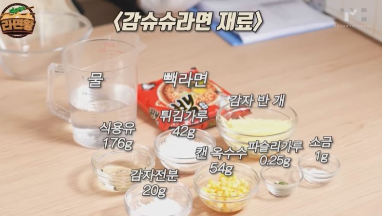 강원도는 옥수수와 감자가 엄청 많이 나와서 할머니가 같을 하고 계시는데 많이 먹어서 라면에 한번 넣어먹어야 겠다 생각해서 튀김으로 만들어서 넣었다고 합니다. 옥수수는 터지고 재미난 식감을 위해 라면에 넣었다고 합니다.
