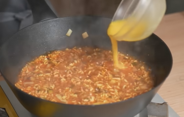 5. 면을 풀어준 뒤 풀어놓은 계란을 붓고 잠시 기다려주세요.