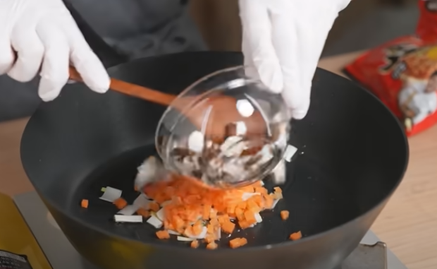 1. 후라이팬에 식용류를 두르고 대파, 당근, 표고버섯 넣어 볶아주세요.