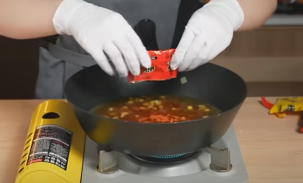 4. 물이 끓으면 잘게 부순 면을 국물에 넣어주세요.