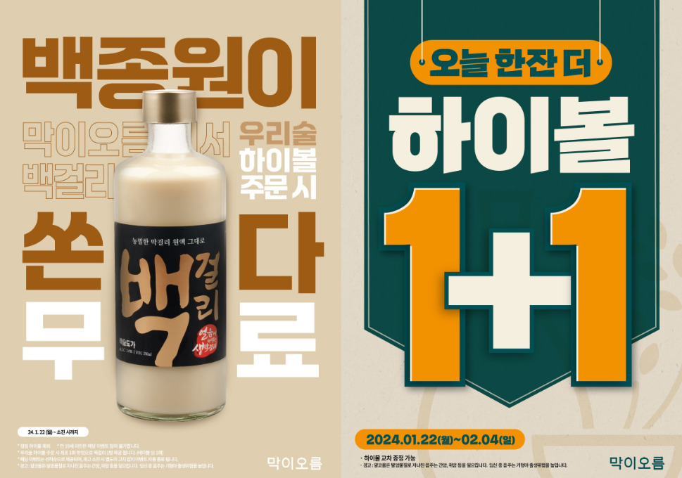 막이오름, 백걸리 무료 / 하이볼 1+1 / '백종원의 우리술' 도서 증정 이벤트 진행 | 더본코리아