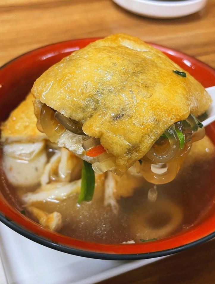 유부주머니에 당면을 넣어서 기름에 한번 튀겨서 오뎅이랑 우동이랑 같이 뜨끈하게