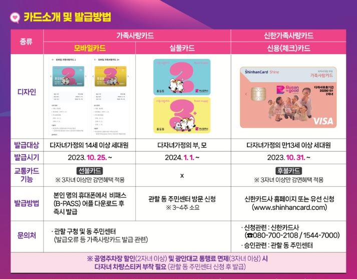 부산광역시 다자녀가정 우대 "가족사랑카드" 주요 혜택(2자녀, 3자녀 수정 내용)