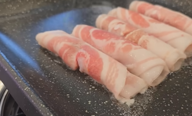 얼린 삼겹살은 큰 소시지 모양처럼 되면 두께 1mm로 썰어냅니다.