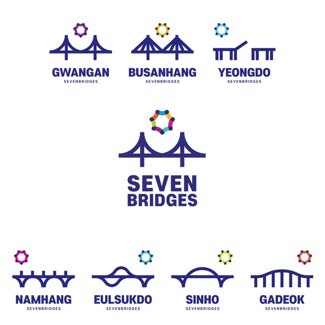 지난 3월 시민참여 선호도 조사를 통해 세븐브릿지의 교량별 특징을 담아낸 브랜드 이미지(BI)를 개발했습니다. 각 교량이 가진 특징을 형상화하고 교량 위에 테마별 색상*의 축포를 넣어 세븐브릿지에서 펼쳐지는 즐거움을 표현했으며, 부산의 랜드마크인 광안대교를 통합 BI로 내세웠습니다.