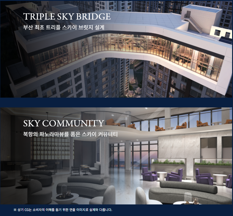해링턴 마레는 부산 최초의 트리플 스카이 브릿지 설계를 도입하여 단지 전면부 4개의 주동을 연결합니다. 이를 통해 북항 오션뷰 조망을 극대화하고 입주민들의 편의를 고려한 특화 커뮤니티 시설을 조성합니다. 스카이 브릿지는 스카이 파티룸(15층), 스카이 게스트룸(26층), 스카이 라운지(35층)로 구성되어 있습니다.