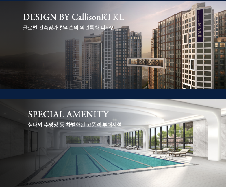 또한 해링턴 마레는 입체적인 입면 패턴과 곡선을 활용한 수려한 디자인을 채택하여 품격을 높였습니다. 저층부 석재마감과 커튼월룩을 통해 우수한 경관을 연출하며, 다양한 공간에 고품격 커뮤니티 시설을 마련합니다. 피트니스 시설부터 사우나, 노래연습실, DIY룸, 문화강좌실, 시네마룸까지 다양한 엔터테인먼트 공간을 제공합니다.