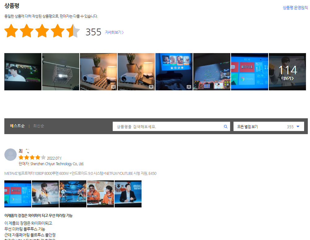 30만원이 넘는 빔프로젝터가 부담되신다면 추천하는 제품으로 가성비 좋은 제품으로 낭만을 즐길 수 있습니다.