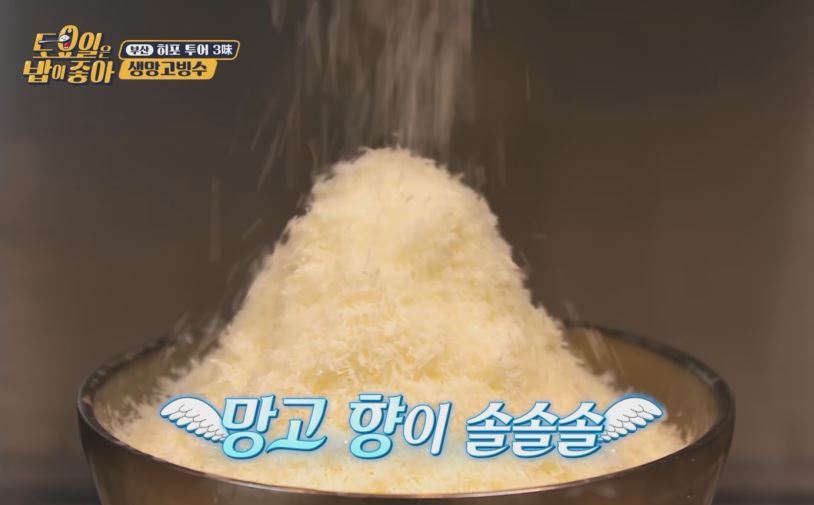 눈꽃 얼음은 우유에 망고 분말을 섞어서 빙수기에서 급속 냉각 후 빙수 기계로 내려서 만듭니다.