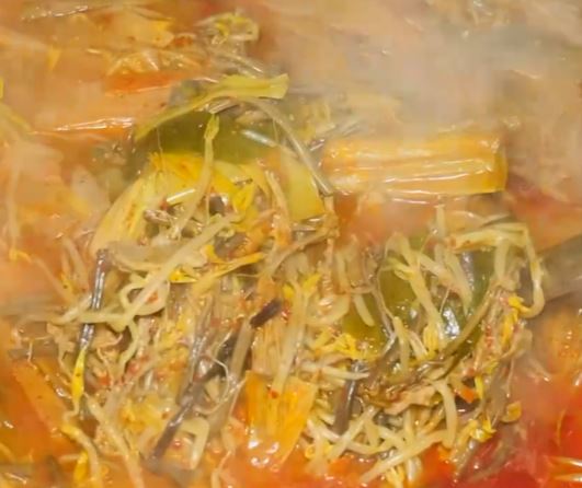 여기에 숙주, 고사리, 토란대 등은 넣어 만든 양념장으로 40분간 끓여주면 얼큰한 맛에 가마솥 육개장 전골이 탄생합니다.