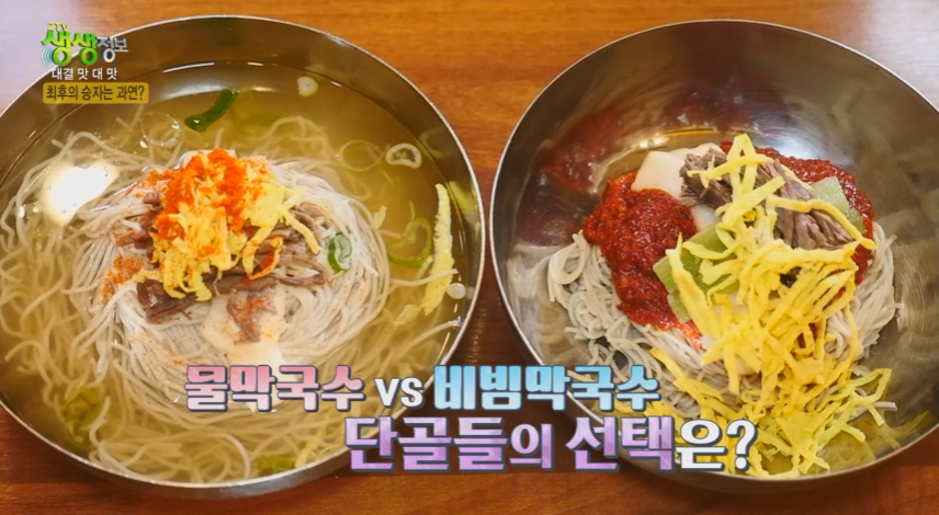 한여름의 더위를 식혀줄 맛대결이 펼쳐졌습니다. 이번 대결의 주인공은 물막국수와 비빔막국수입니다. 서울에서 한 시간 반 걸려 찾아온 손님들도 이 두 메뉴를 맛보러 왔는데요, 인증 사진까지 찍으며 즐기는 모습이 인상적입니다.