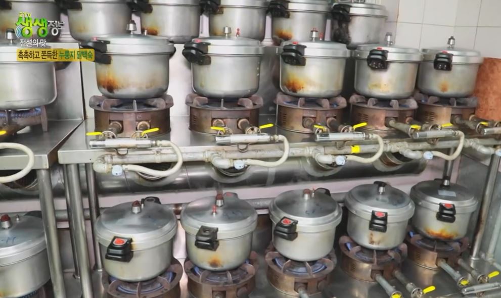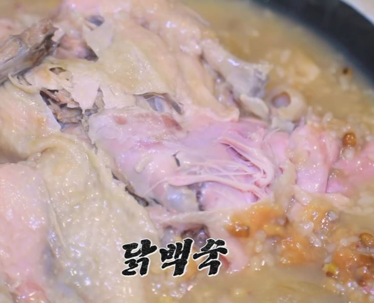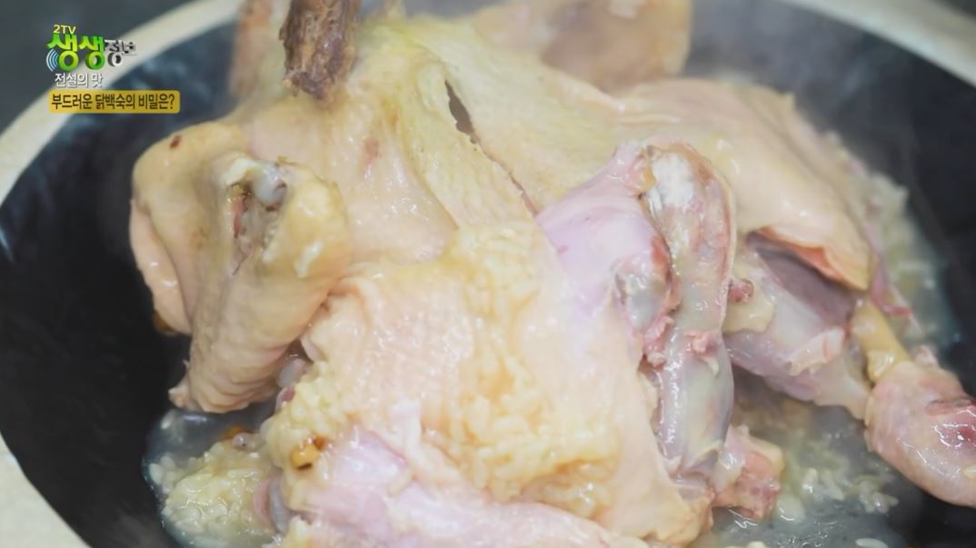 닭백숙을 푹 삶아 보기만 해도 야들야들한 닭다리와 기름기 없이 담백한 가슴살까지 이게 바로 30년 전통 누룽지 닭백숙 영양 가득 찹쌀 위에 푸짐한 토종닭 한 마리 올리고 보약 같은 육수 넣고 몸에 좋은 대추, 은행, 마늘, 퐁덩 이제 압력밥솥에서 부들부들하게 1시간 정도 삶아주면 닭백숙 완성. 여러분 보양식의 절대강자 잘 익은 닭백숙 좀 보세요.