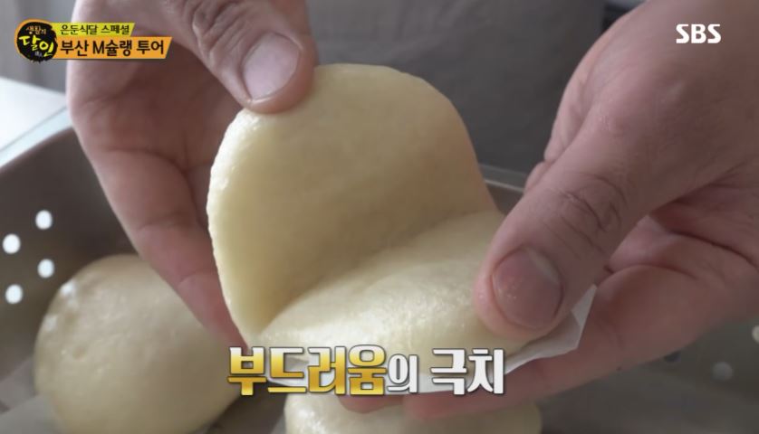 반죽을 정해진 양으로 덜어내는 데 그치지 않고 마치 만두를 입는 듯한 동작으로 수없이 덮고 누르기를 반복하는 달인 반죽의 쫄깃함을 높이는 과정인 거죠.
