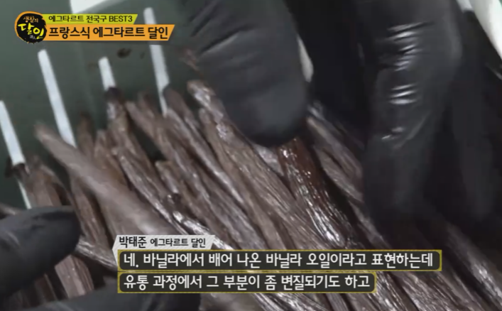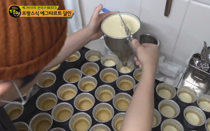 그리고 여기에 바닐라 향이 가득한 크림이 채워지면서 달인의 에기타르트는 오븐 속으로 들어갑니다.