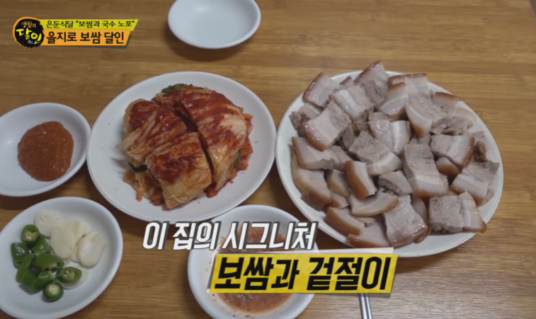 야들야들 쫀득한 식감에 보쌈하면 빠질 수 없는 김치, 김치 안에는 오징어가 들어가 있어서 보쌈과 김치 오징어를 함께 싸서 먹으면 환상적인 조합입니다.