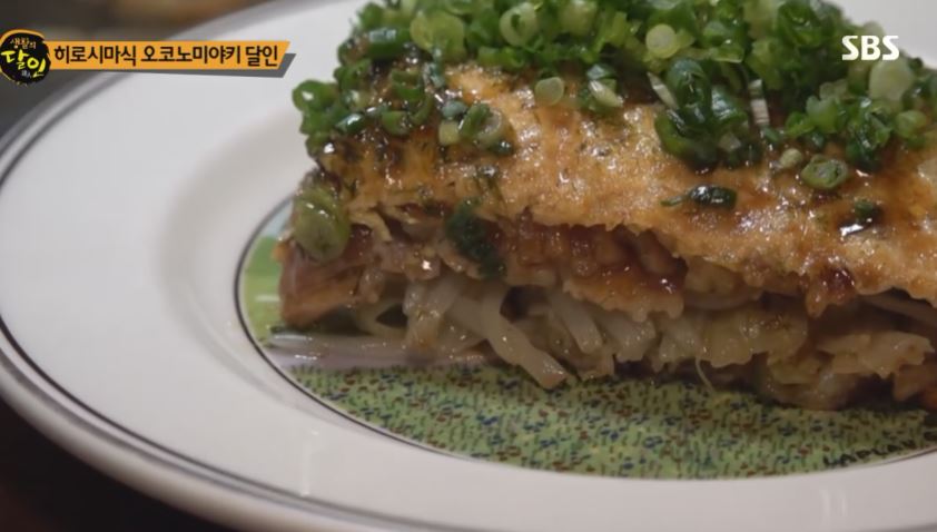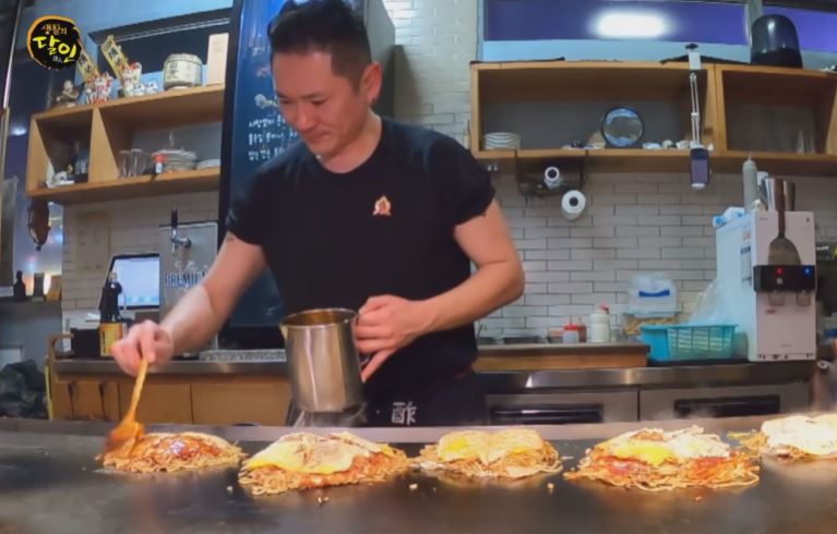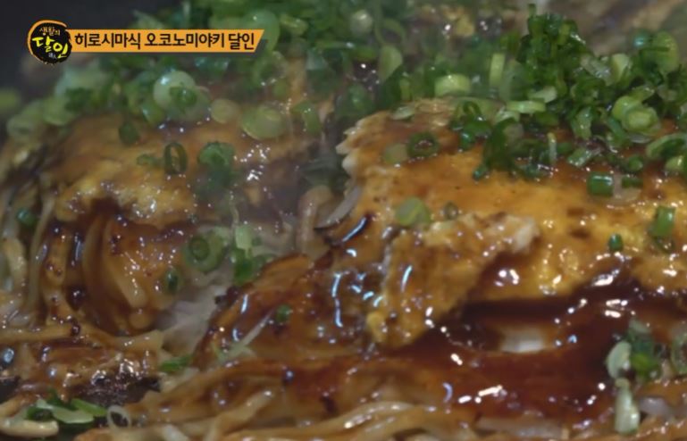 달인의 히로시마식은 불에 달궈진 철판 위에 밀정병, 반죽을 얇게 펴 그 위에 양배추, 파, 튀김, 숙주, 무기 등 각종 재료를 칭칭 올려서 구워주는데요.