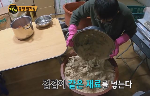 싱싱한 멍게와 쌀겨, 살아있는 바다게, 오만둥이, 원당 사탕수수를 1년간 삭혀서 원액으로 만들어서 물에 희한해서 딸기에 비료로 뿌린다고 합니다.