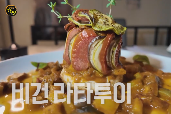 이어 나오는 요리들은 모두 코스로 제공되며, 그중에서도 시그니처 메뉴인 '비건 라따뚜이'는 영화 라따뚜이에서 등장한 요리를 그대로 재현한 요리입니다. 얇게 썬 채소들이 아름답게 쌓여 있는 이 라따뚜이는 두부를 밑에 깔아 한국적인 감성을 더한 프랑스 가정식 요리입니다. 신선한 재료들로 채워진 라따뚜이는 건강하면서도 깊은 맛을 자랑합니다.