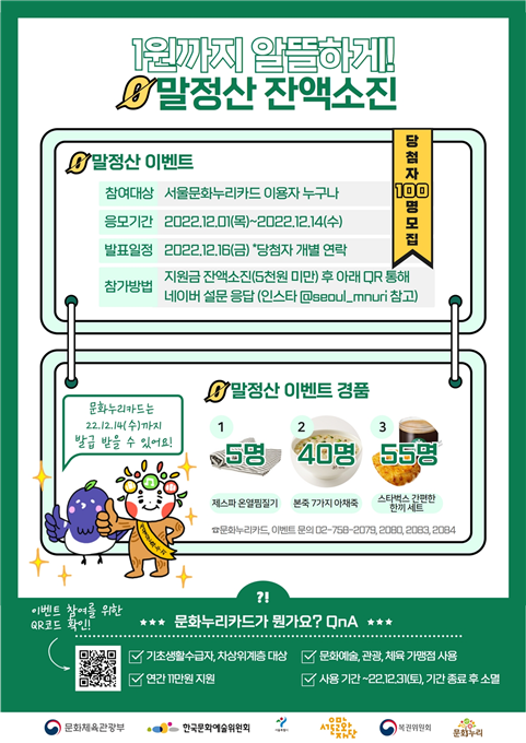 □ 한편, 서울문화재단은 ‘문화누리카드’ 이용 촉진을 위해 사용 잔액을 인증하는 <서울문화누리 0말 정산> 이벤트를 12월 1일(목)부터 14일(수)까지 진행합니다.