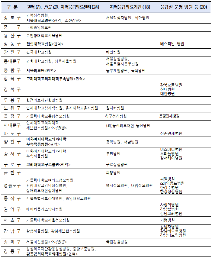 ※ 소아전문응급의료센터 3개소(서울대학교병원, 연세세브란스병원, 서울아산병원)