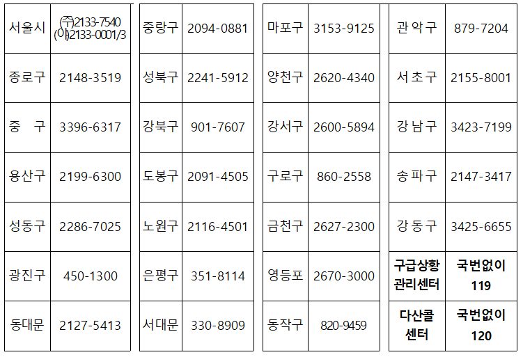 | 서울의료원 | 보라매병원 | 동부병원, 서남병원 | 24시간 응급 진료 |