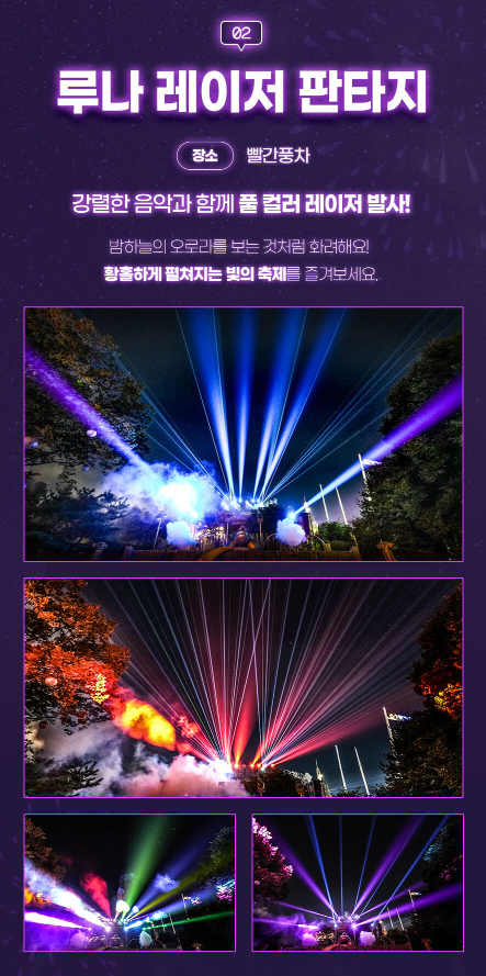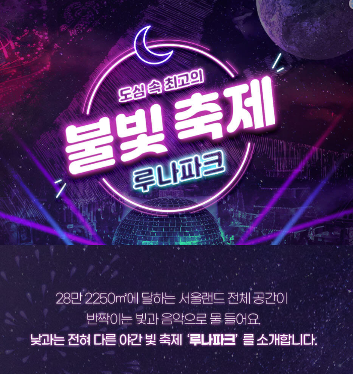 서울랜드 빛축제 '루나파크'는 서울에서 가장 가까운 빛 축제로, 매일 밤 서울랜드의 28만 2250㎡의 넓은 공간 전체가 거대한 빛의 공연장으로 새롭게 변신해 환상적인 분위기의 라이트닝 공연이 펼쳐집니다.