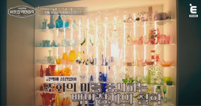 욕실에는 각종 유리 오브제와 소장품이 진열돼 있는데, 이 중 일부는 1,000원짜리부터 수백만 원에 이르는 것까지 다양합니다. 가장 비싼 그림은 욕실에 두지 않았지만, 오히려 그곳에서 자신이 진정 좋아하는 것들과 마주하는 시간을 더 소중히 여기는 모습이 인상 깊습니다.