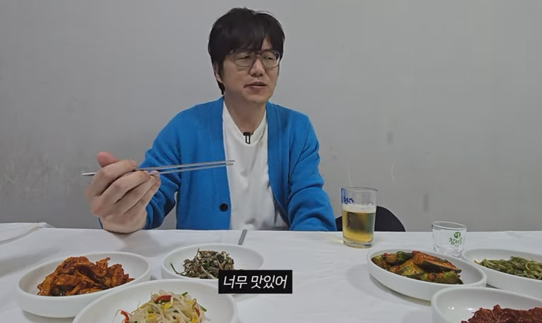 미리나온 반찬에 감탄하고 소주 한잔 마시며 맛있다고 좋아합니다.