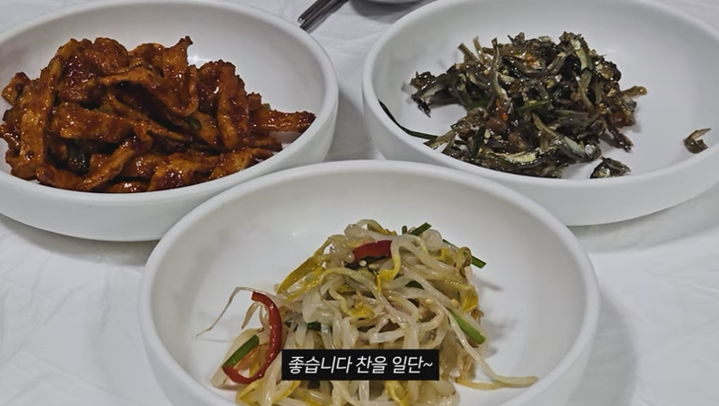 미역줄기와 멸치 젓갈에 감탄하며 즐거운 식사를 합니다.