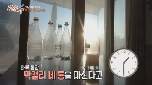 아침 8시부터 저녁 6시까지 오직 막걸리로 하루를 채우며, 하루 평균 4병 이상을 마신다고 합니다.