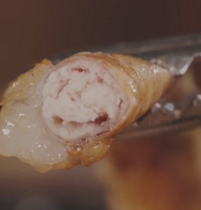고소한 소기름을 약불에 녹이면 곱창을 넣고 튀겨줍니다. 곱창이 꼬이지 않게 돌돌 모양을 잡아줍니다.