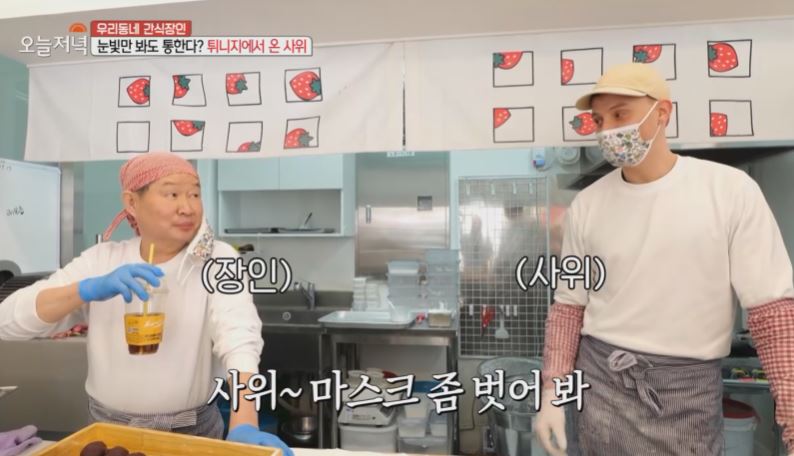 튀니지에서 온 사위와 함께 딸기찹쌀떡을 만들고 있습니다.