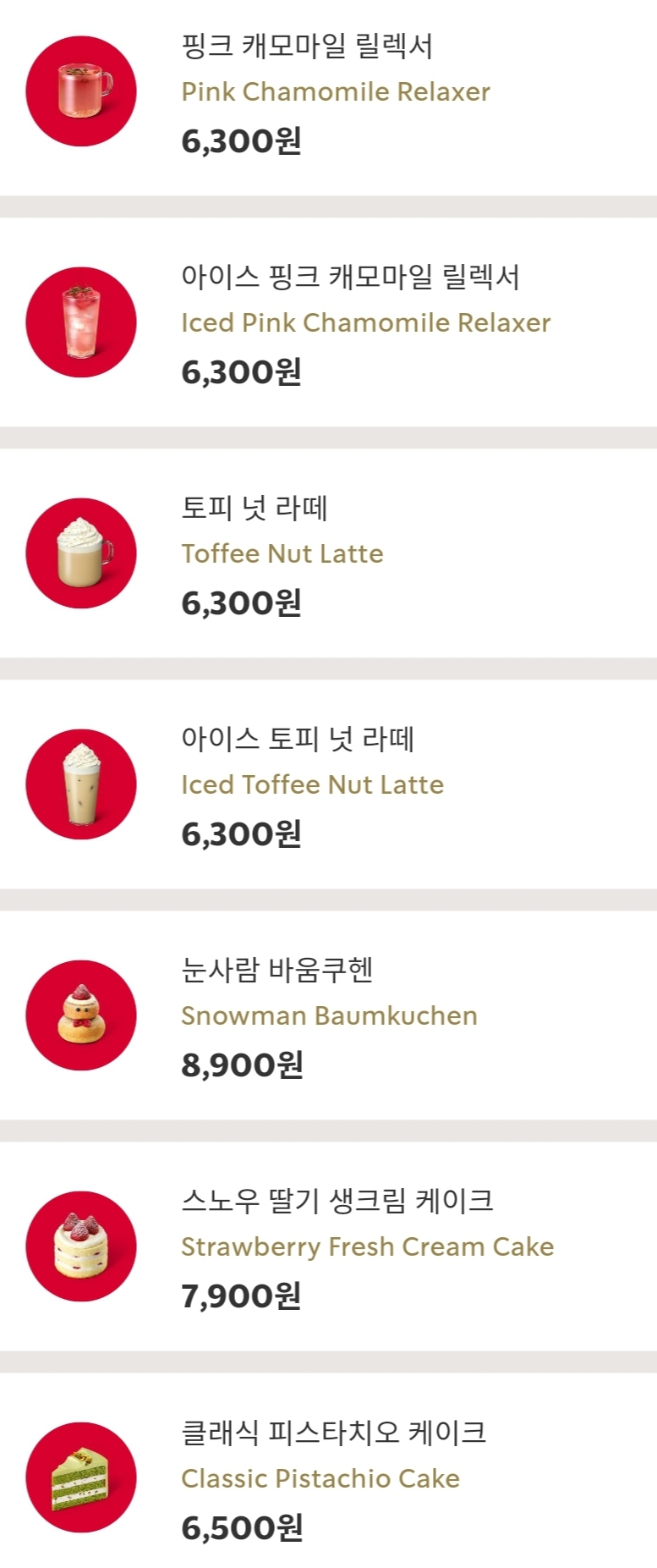 이번 시즌에는 매년 크리스마스에 인기를 끌었던 ‘토피넛 라떼’, ‘핑크 캐모마일 릴렉서’, ‘말차 크림 브륄레 라떼’, ‘더블 에스프레소 크림 라떼’가 계속해서 판매됩니다.