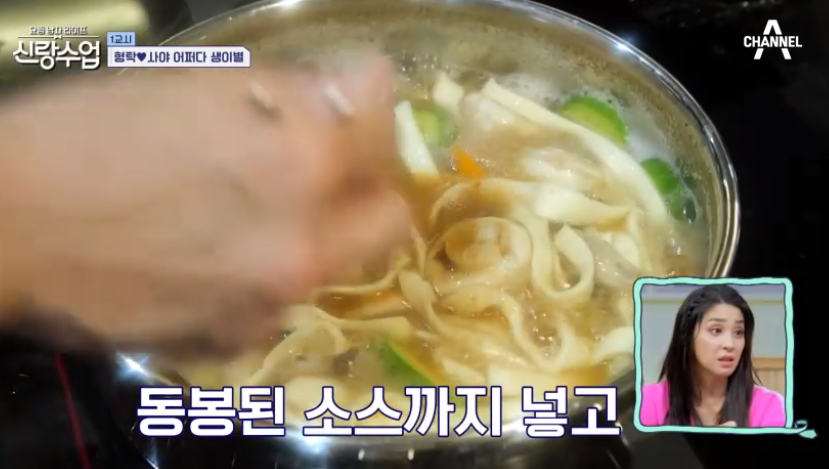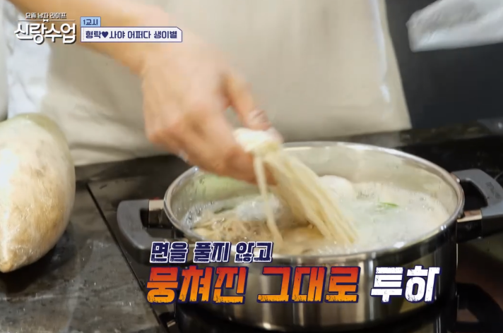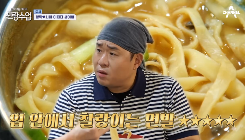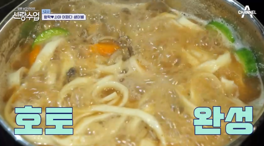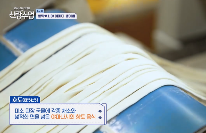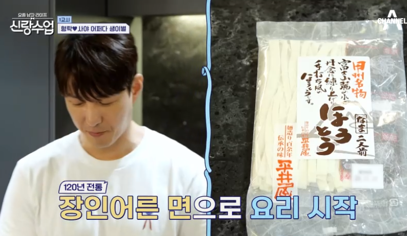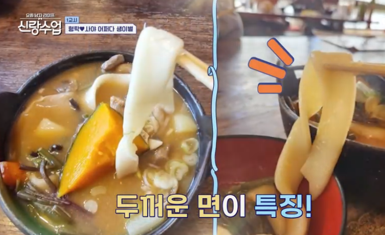 심형탁은 자부심 가득한 표정으로 이어졌다. "겉절이에는 국수, 면이야. 우리 장인어른이 만든 국수 가문의 자랑스런 면이야. 야마나시 현의 정통면 '호토면'이라고 야마나시현의 특산품입니다."