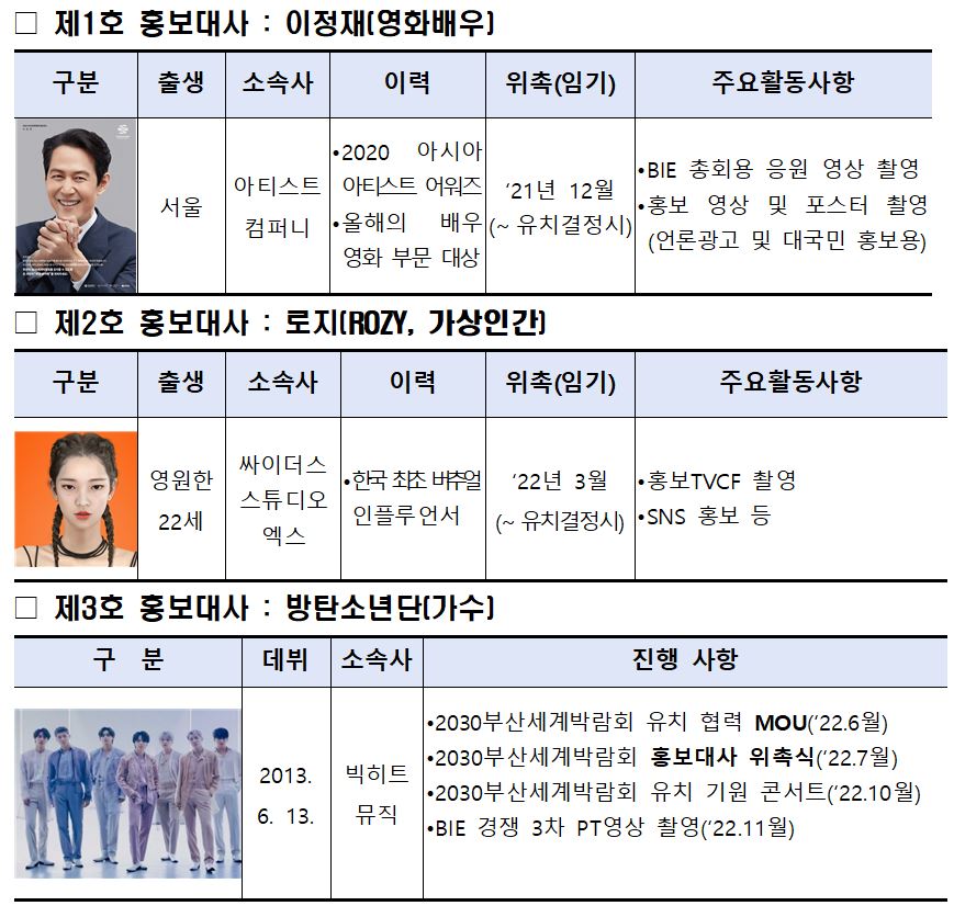 신이 내린 목소리’ 조수미 씨, 2030 부산세계박람회 홍보대사 됩니다. 이정재, BTS 이어 홍보대사 합류로 문화예술단체와 예술인들의 동참과 국내·외적인 관심과 지지를 대폭 이끌어내 주실 것으로 기대합니다.
