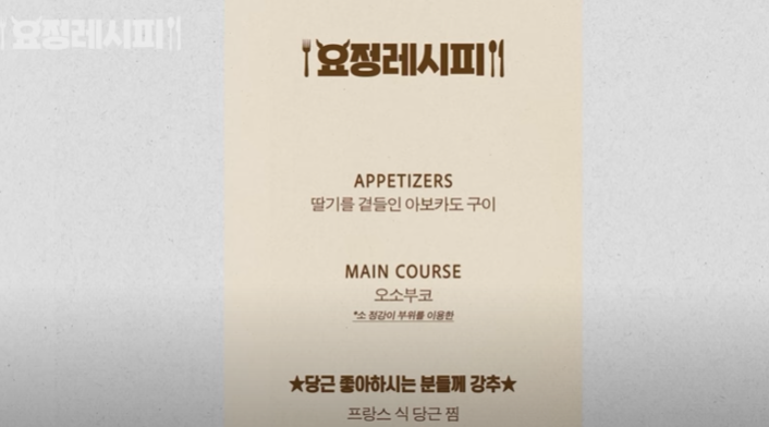 요정재형 유튜브 채널에 BTS 제이홉이 게스트로 출연, 제이홉을 위해 요리로 프랑스 가정식 스타일의 아보카도 구이, 당근찜, 오소 부코 레시피를 소개합니다.