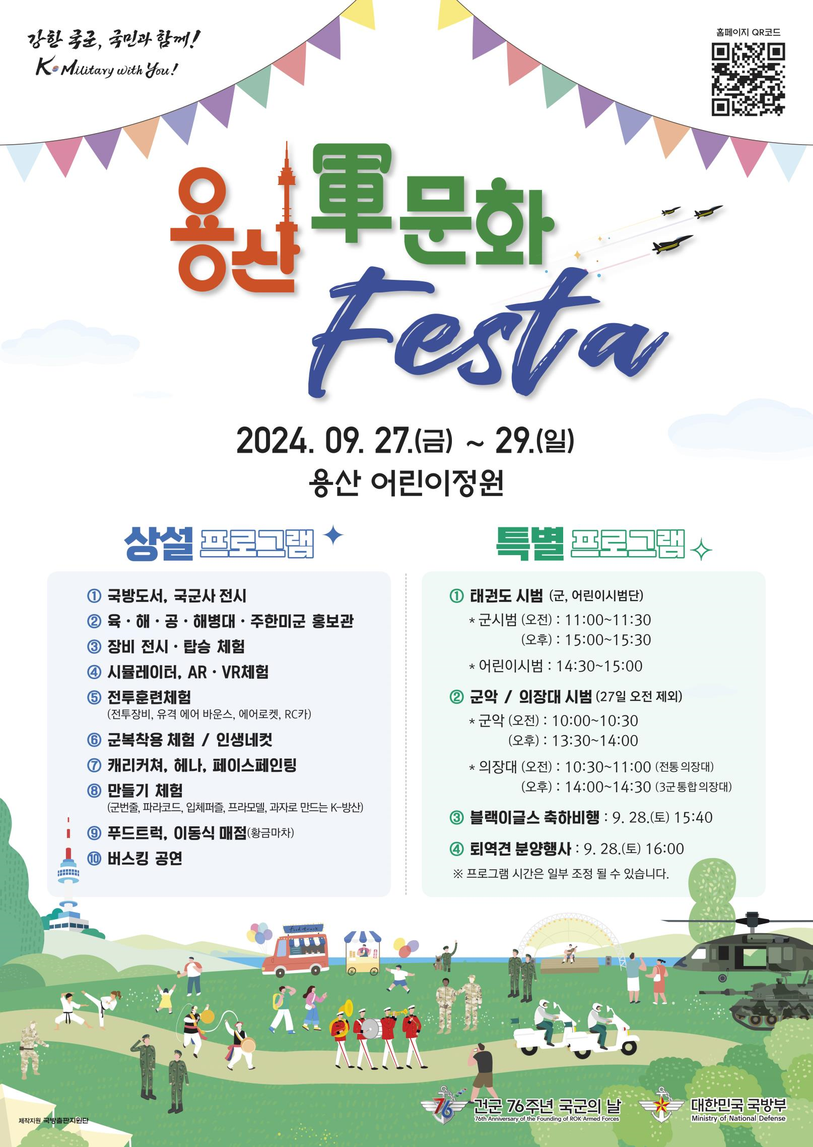 우리 국민이 군() 문화를 체험할 수 있는 행사로는 927일부터 29일까지 용산에서 군 문화 페스타가 용산 어린이정원에서 진행됩니다.