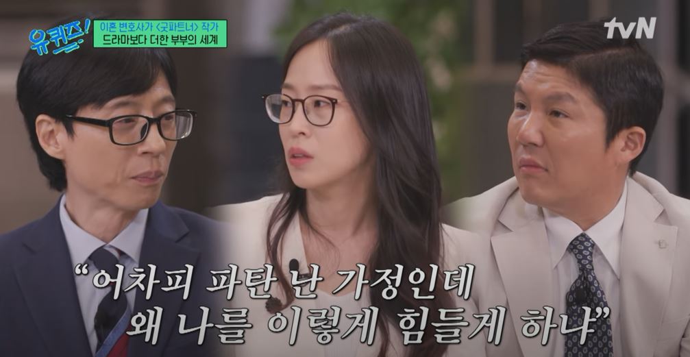 유퀴즈온더블럭 굿파트너 작가 이혼 변호사의 충격적인 실제로 2년동안 같이 사는 시누이가 알고보니 내연녀, 외도 키트, 동시에 6명, 캠핑장 아이들 옆에서 등 상상초월 현실을 이야기합니다.