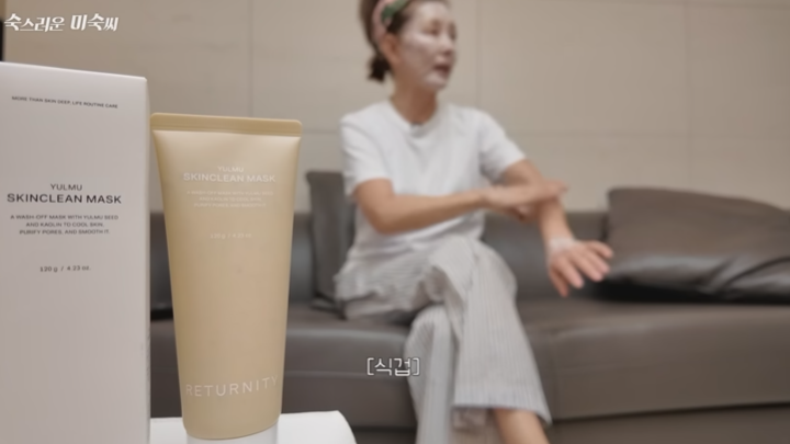 특히 율무 성분의 팩을 직접 소개하며, 외부 활동으로 자극받은 피부를 진정시키는 데 효과적이라고 말합니다.
