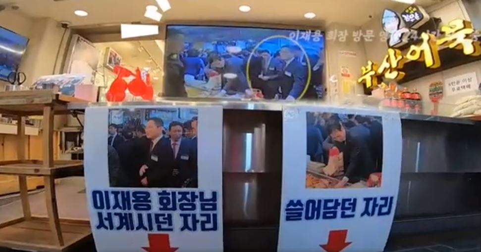 어묵집 앞에는 이재용 회장님 서계시던 자리의 사진과 현장의 영상을 계속 방영하면서 적극적으로 홍보를 하고있습니다. 전세계적인 기업의 오너를 활용한 마케팅 전술은 저렴한 비용으로 엄청나게 큰 효과를 거두고 있습니다.