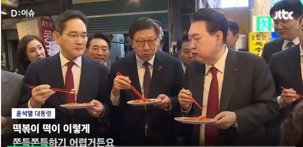 '2030 부산 엑스포' 유치 실패 후 부산 위로 차 윤대통령이 재벌 총수들과 부산을 방문해서 떡볶이 빈대떡 먹방을 하였습니다. 부산의 대표적인 전통시장인 부평깡통시장을 방문하여 "엑스포 전시장을 세울 자리에 외국 투자 기업들을 유치하여 부산을 더 발전시킬 테니 걱정하지 말라"며 지역 경제 발전에 대한 의지를 밝혔습니다.
