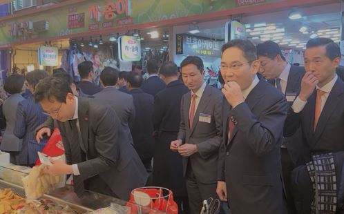 이 회장은 부평깡통시장에서 떡볶이, 어묵 등을 먹고 있는데 한 시민이 "잘 생겼다"고 말하자 입에 손가락을 대며 '쉿'하는 표정을 지어 부산 방문 짤로 화제가 되기도 했습니다.