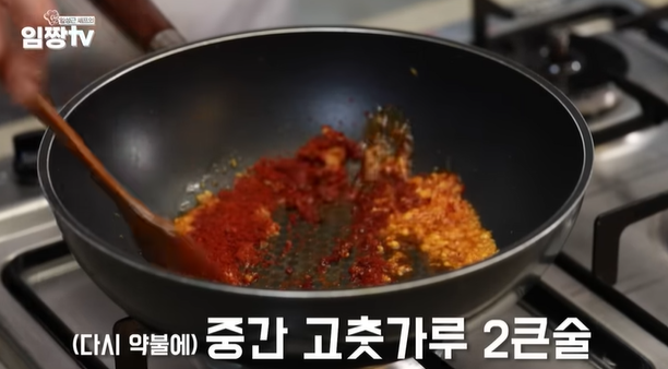 불을 약불로 줄인 뒤 고춧가루를 넣어 고추기름 베이스 완성
