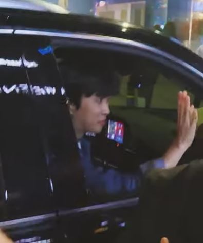 콘서트를 마치고 돼지국밥을 먹고 식당 밖에서 기다리고 있는 팬들을 위해 차에서 내려서 인사하는 사진입니다.