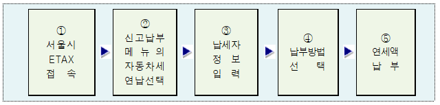 ○ 서울시 ETAX(etax.go.kr)에 접속해 ‘자동차세 연납’을 선택·신고한 뒤, 납세자 정보(성명, 차량번호 등) 입력 및 납부방법(계좌이체, 카드납부)을 선택하여 자동차세를 납부하면 됩니다.