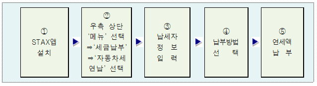 ○ 애플 「앱스토어」나 구글 「플레이스토어」에서 ‘서울시 세금납부’로 검색하여 ‘STAX앱’을 내려 받아 설치 후 상단 ‘메뉴’에서 ‘세금납부’ 선택, ‘자동차세연납 신고납부’ 선택, 납세자 정보(성명, 차량번호 등) 입력, 납부방법(계좌이체, 카드납부 등) 선택 순으로 납부할 수 있습니다.