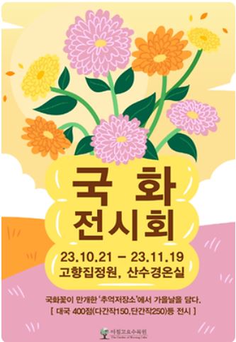 23년 아침고요 제 24회 국화 전시회는 '추억 저장소'를 주제로 실외 전시장인 한국의 미를 느낄 수 있는 '고향집정원'과 실내 전시장인 물이 흐르는 '산수경온실'에서 개최됩니다.