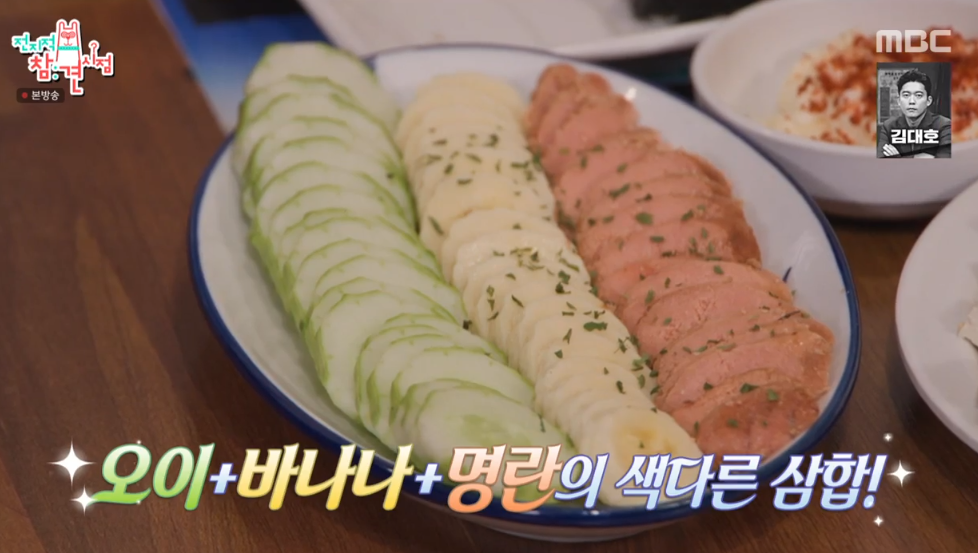 거기에 구운 명란 삼합으로 오이와 바나나를 함께 먹는 색다른 삼합입니다. 바나나가 아보카도 역할을 합니다.