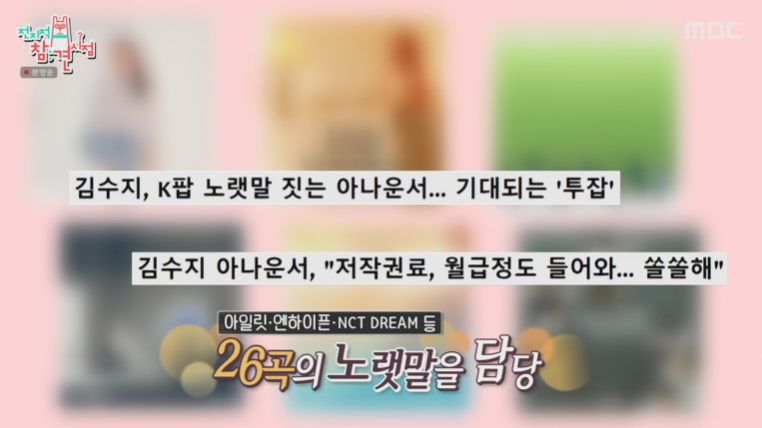 김수지 아나운서는 MBC '전지적 참견 시점'을 통해 앵커, 작사가, 작가로 다양한 활동을 하는 N잡러의 모습을 보여주었으며, 바쁜 일상 속에서도 남편 한기주 씨와의 달달한 러브스토리를 공개해 시청자들의 관심을 받았습니다.