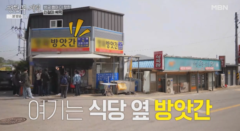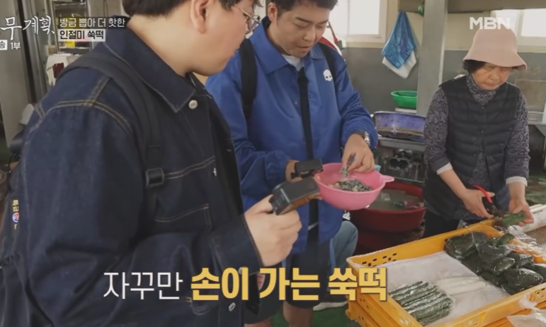 기다리는 동안 바로 옆 방앗간에서 인절미 쑥떡을 먼저 맛봅니다. 전현무는 한입먹고 감탄으로 진짜 맛있다고 합니다.